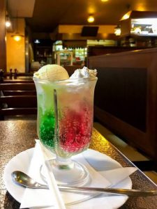 緑とピンクのソーダの上にバニラアイスと生クリームが乗っていて、